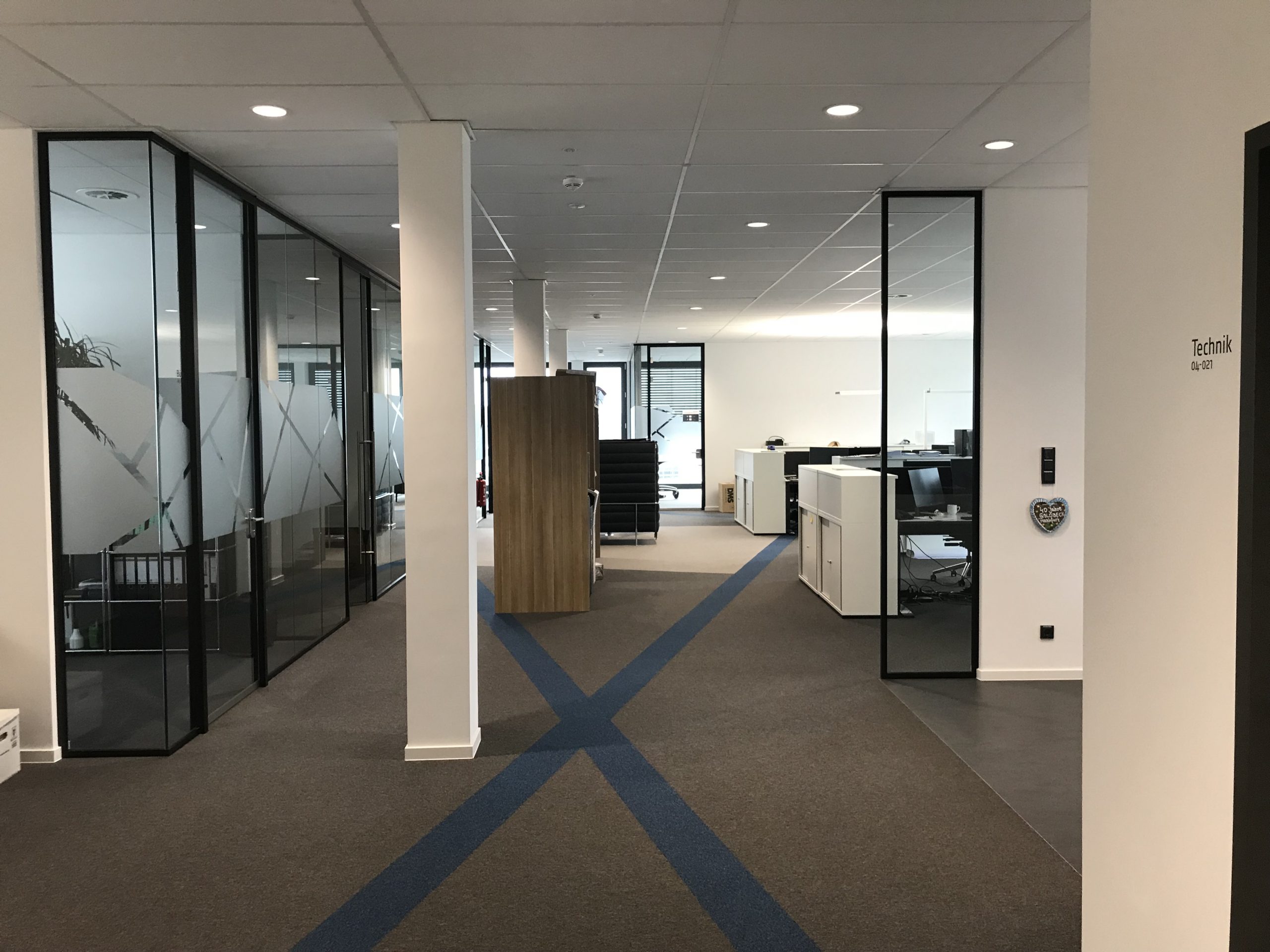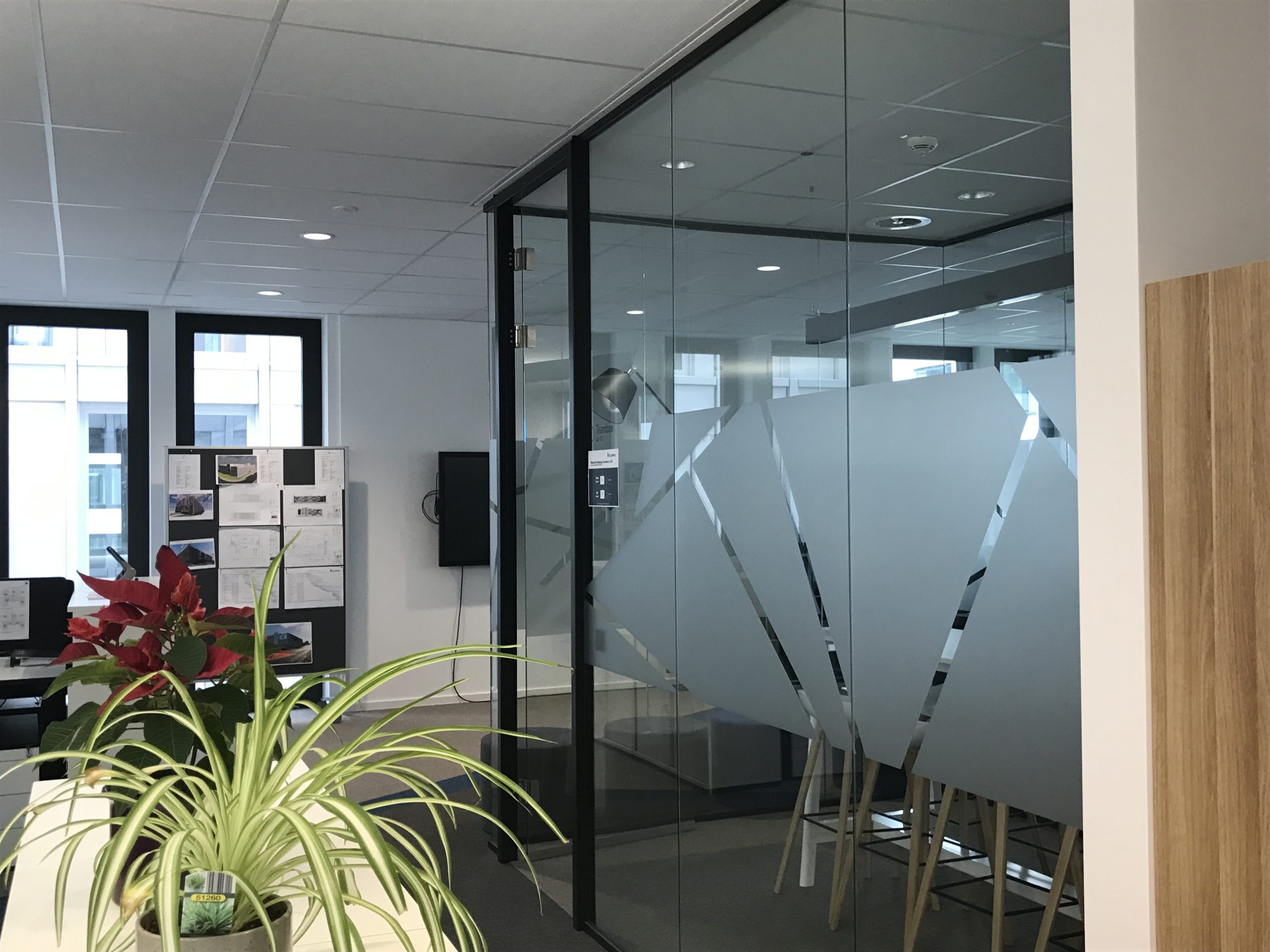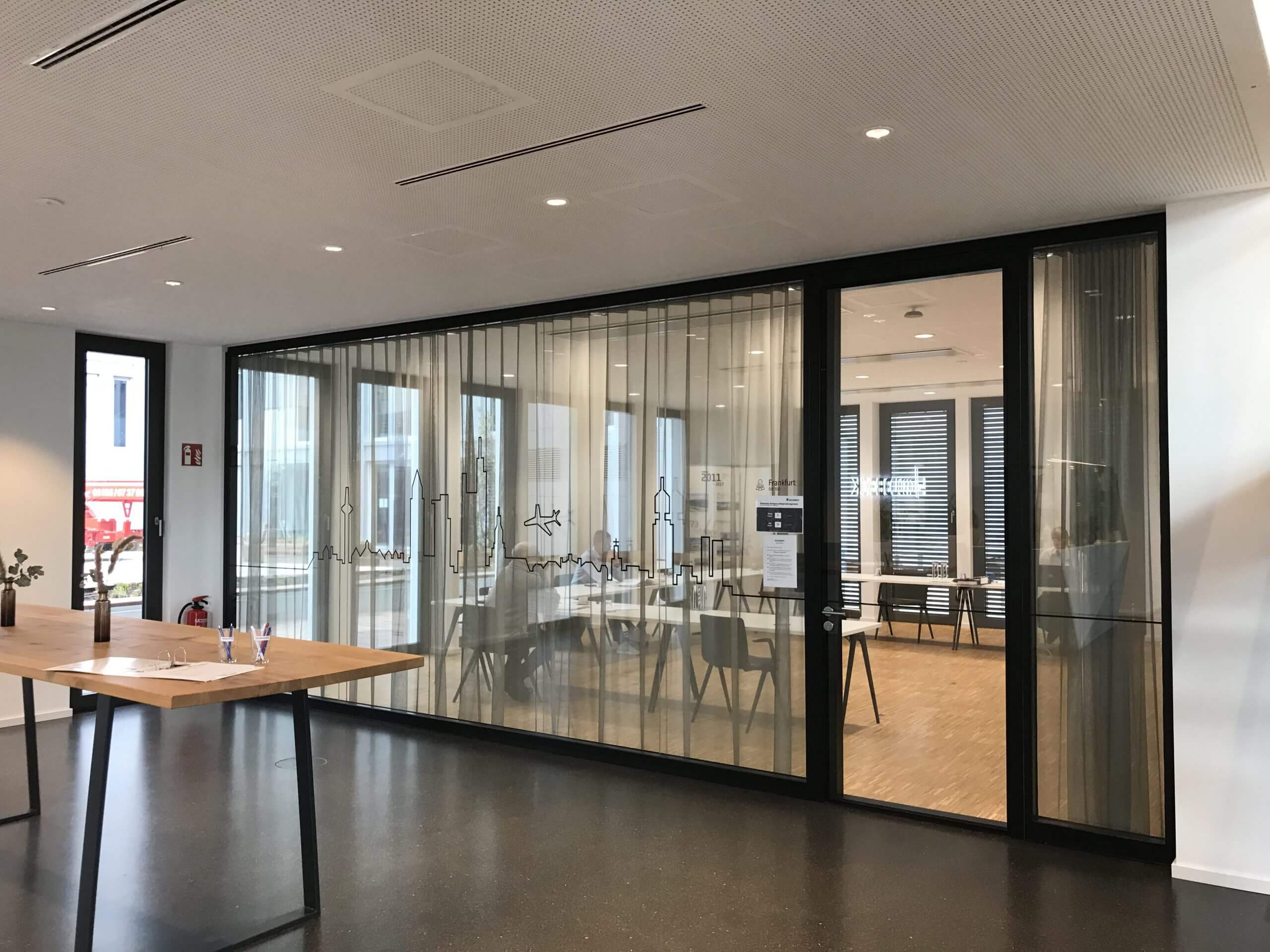 对于不同的会议室,我们使用了我们灵活的玻璃墙解决方案 Panorama。 通过我们的双玻璃墙解决方案 Panorama,我们可以提供高声学性能。 与Panorama相结合,安装了嵌入式玻璃门。