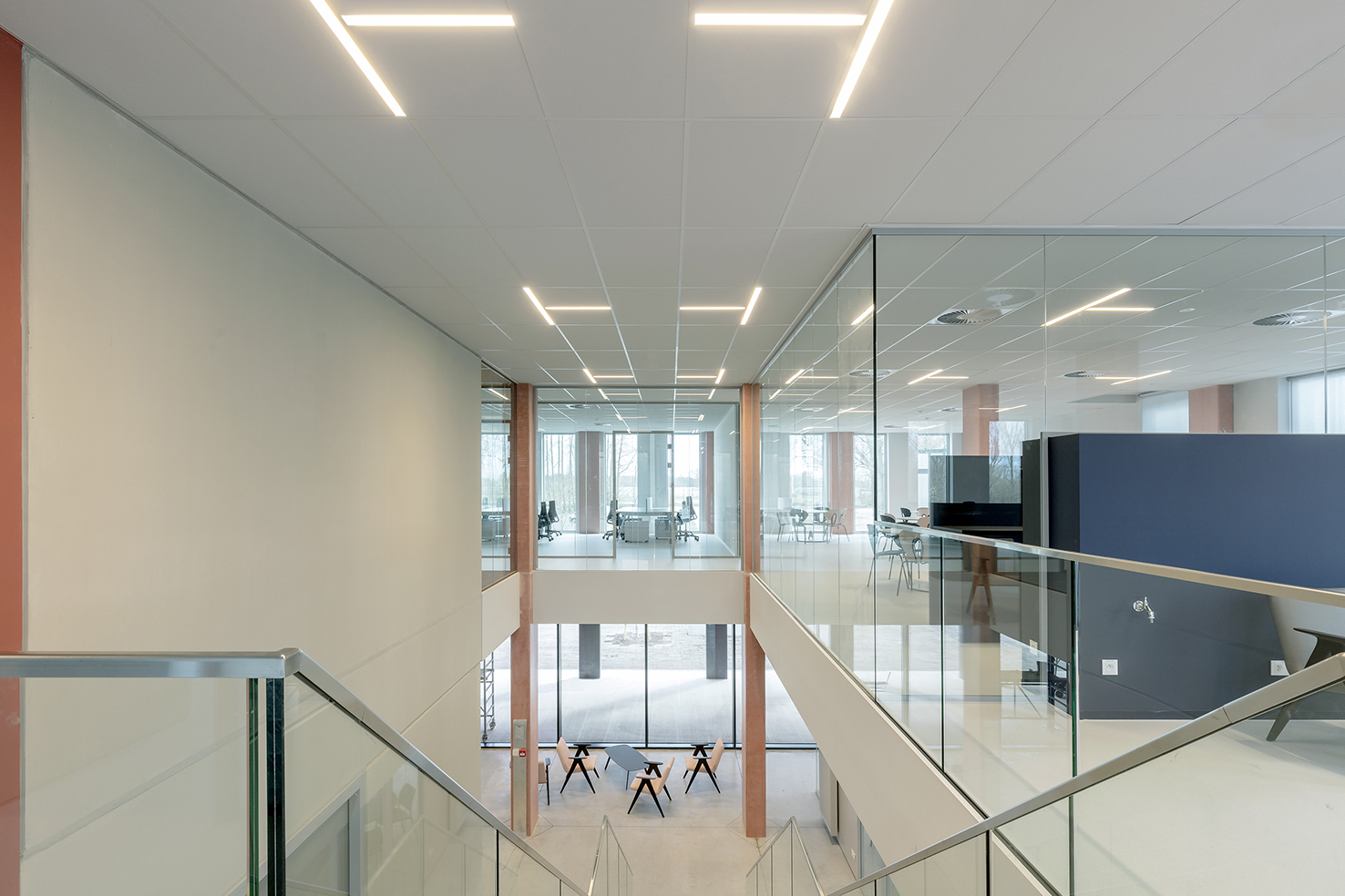 对于这个特殊的项目,建筑师选择在建筑中营造一种温暖的氛围。 为了确保开放和透明的设计,Maars 安装了单玻璃隔板 Horizon。 作为门,选择了简约的玻璃门和具有高性能的平齐玻璃门的组合。 对于像这样的研究中心,卫生是非常重要的,因为我们已经安装了带有钢板的 Metaline 实心墙。