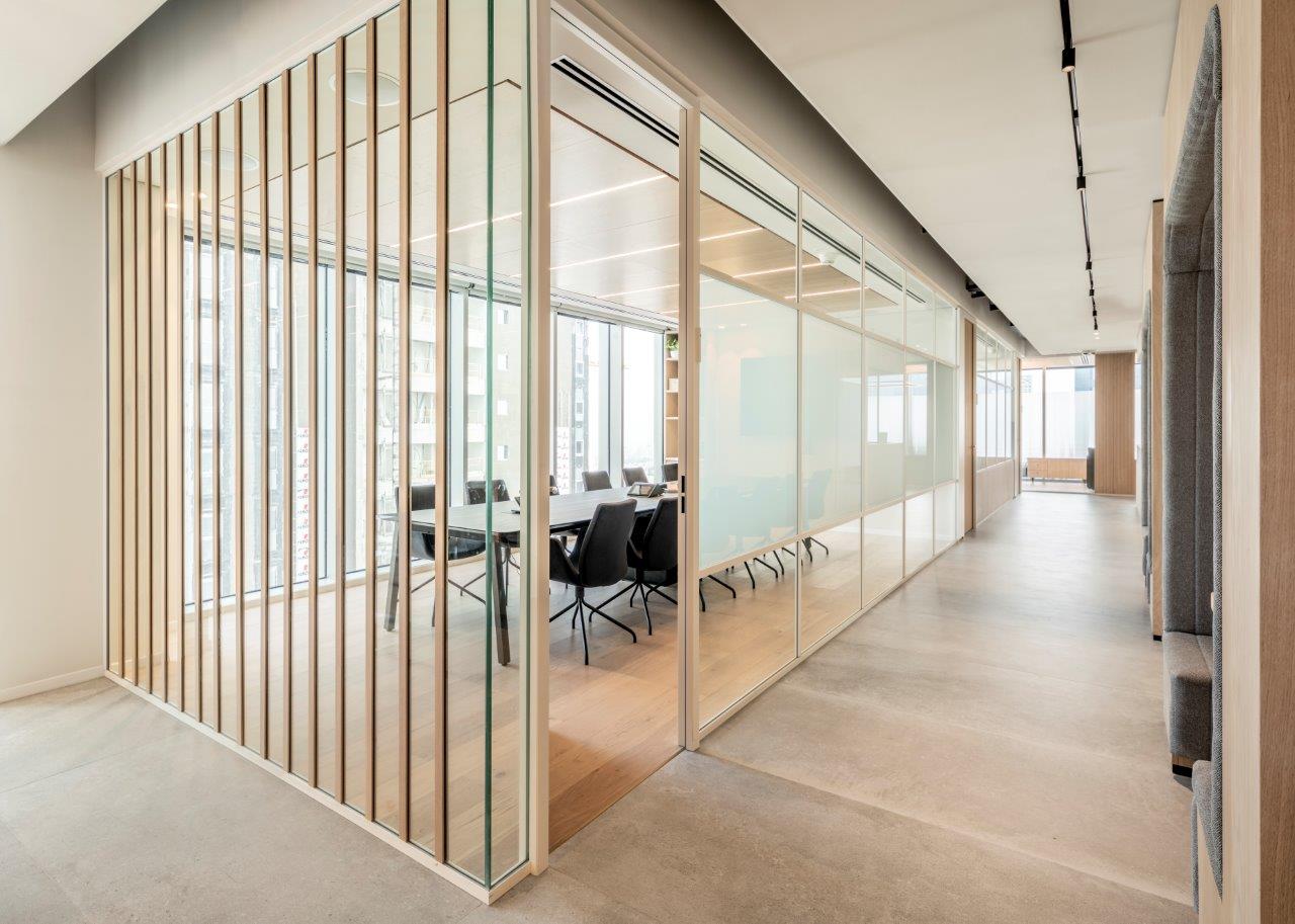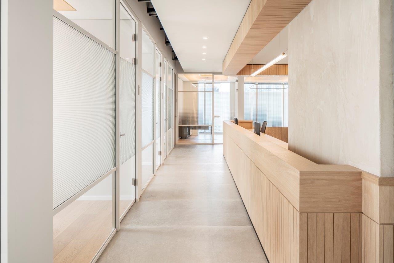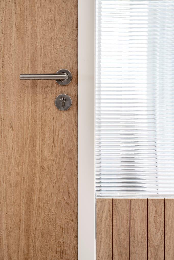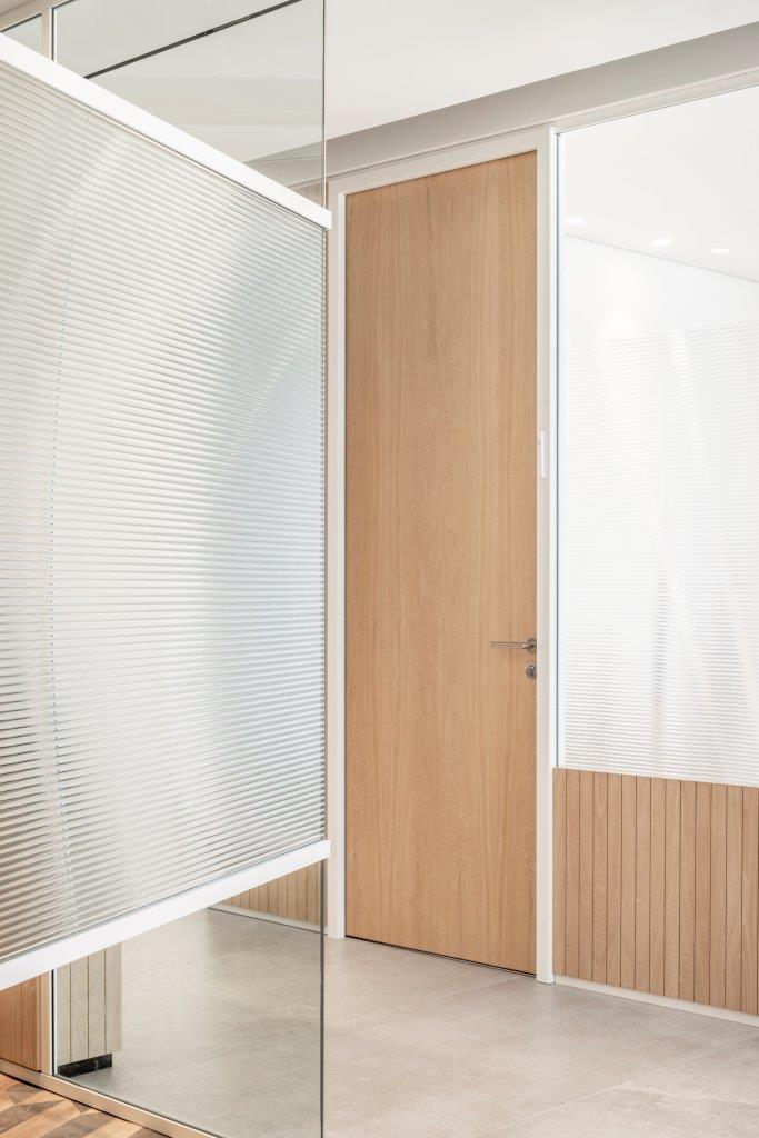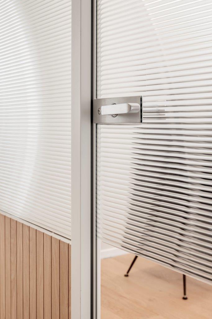 项目中的设计理念与图案相得益彰。 空间的生命力不是通过强烈的色彩,而是通过使用以各种方式表达的线性线条——在隔板的划分、玻璃的质地和接待台的设计中。