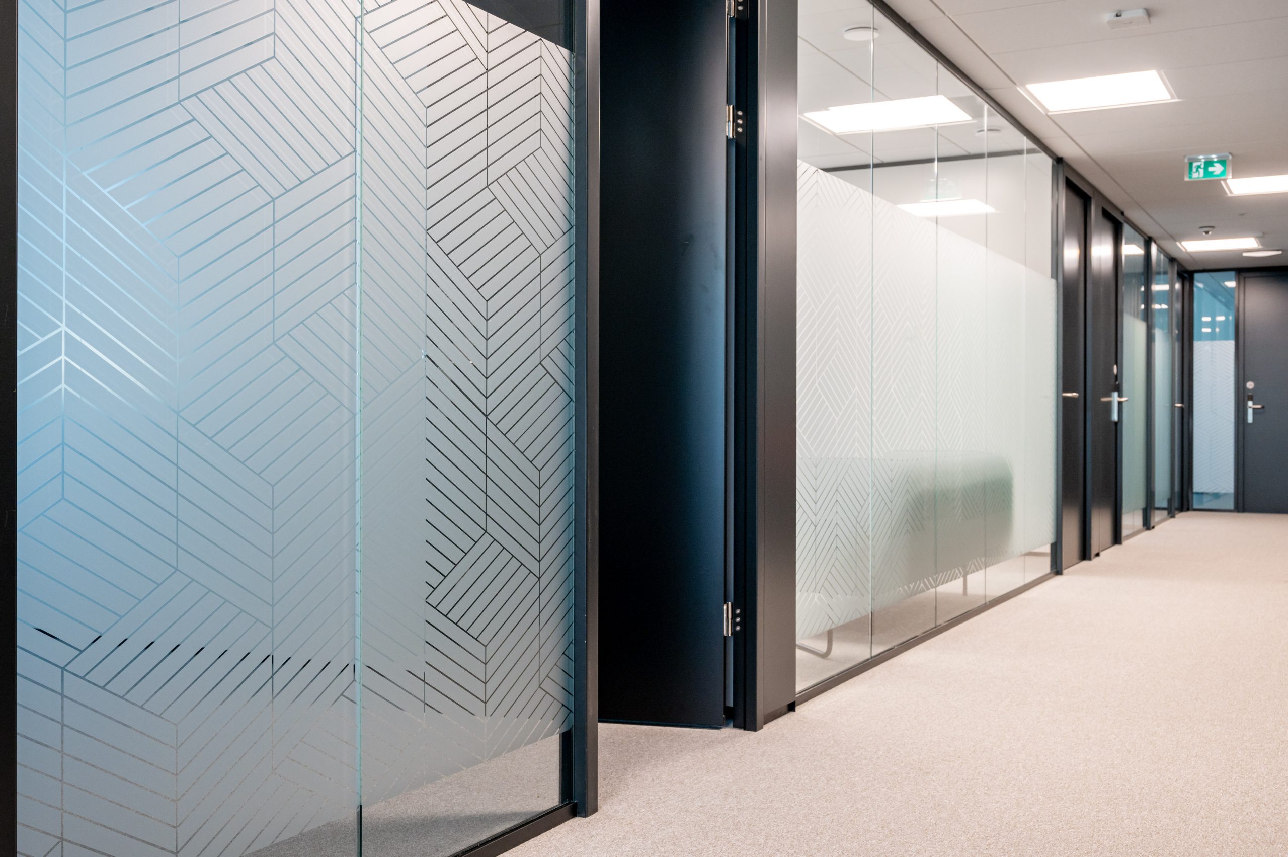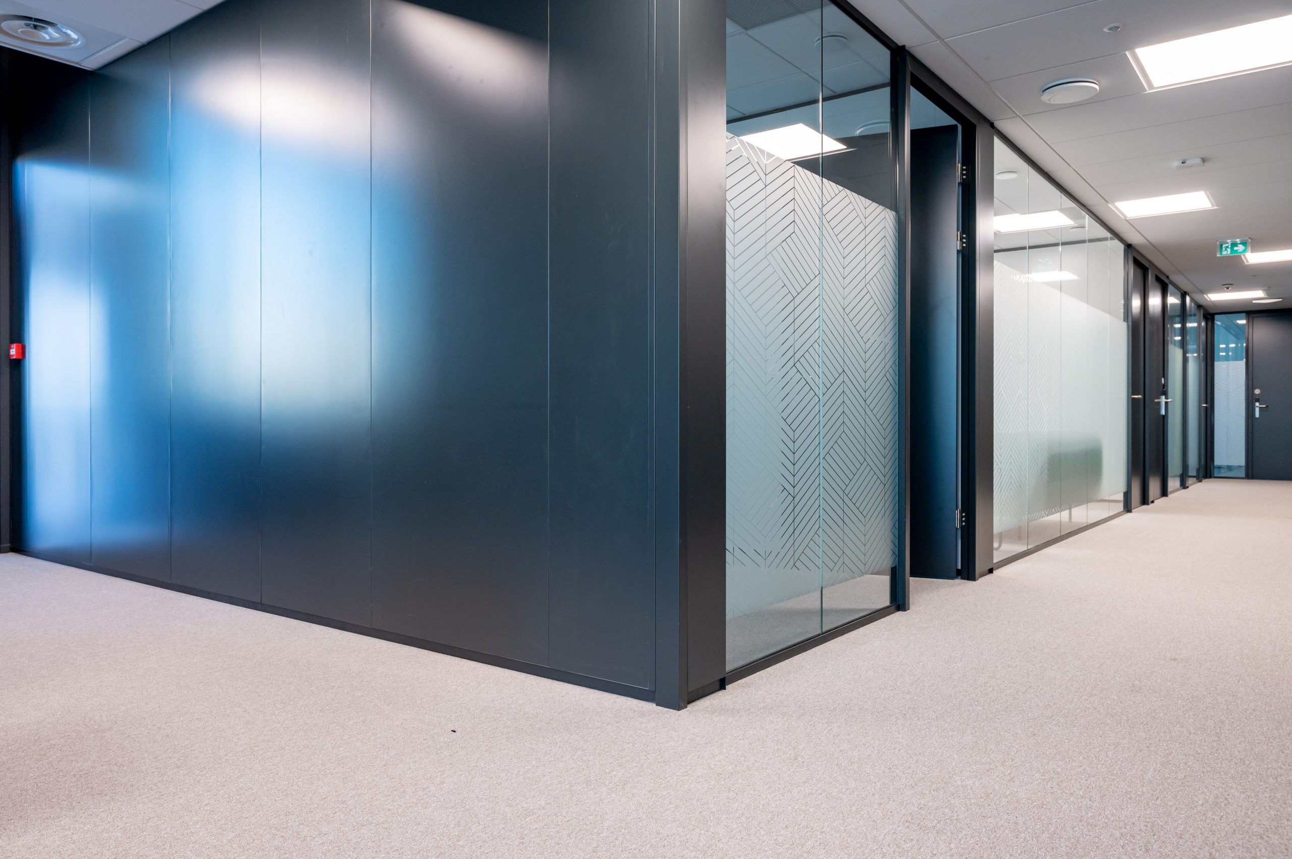 对于这个办公室,我们在办公室之间安装了金属墙。 通过安装灵活的实体隔断,办公空间始终保持灵活。 这样,空间总是可以根据租户的要求进行调整。 玻璃墙是 Horizon,以其简约的外观而闻名。