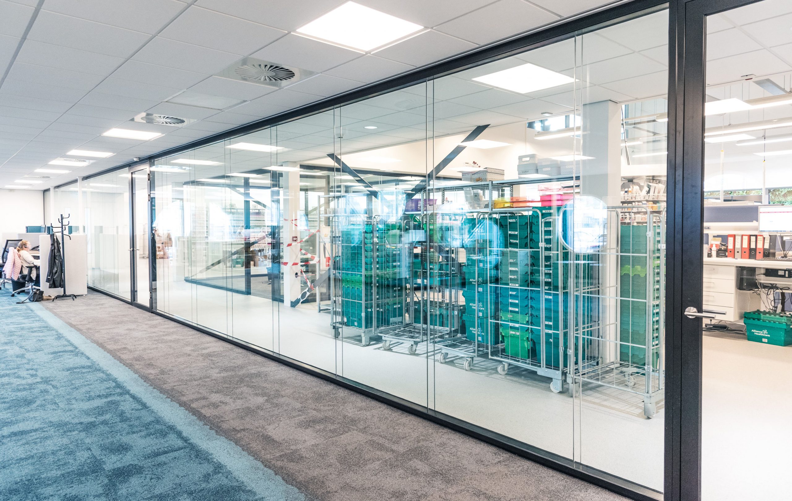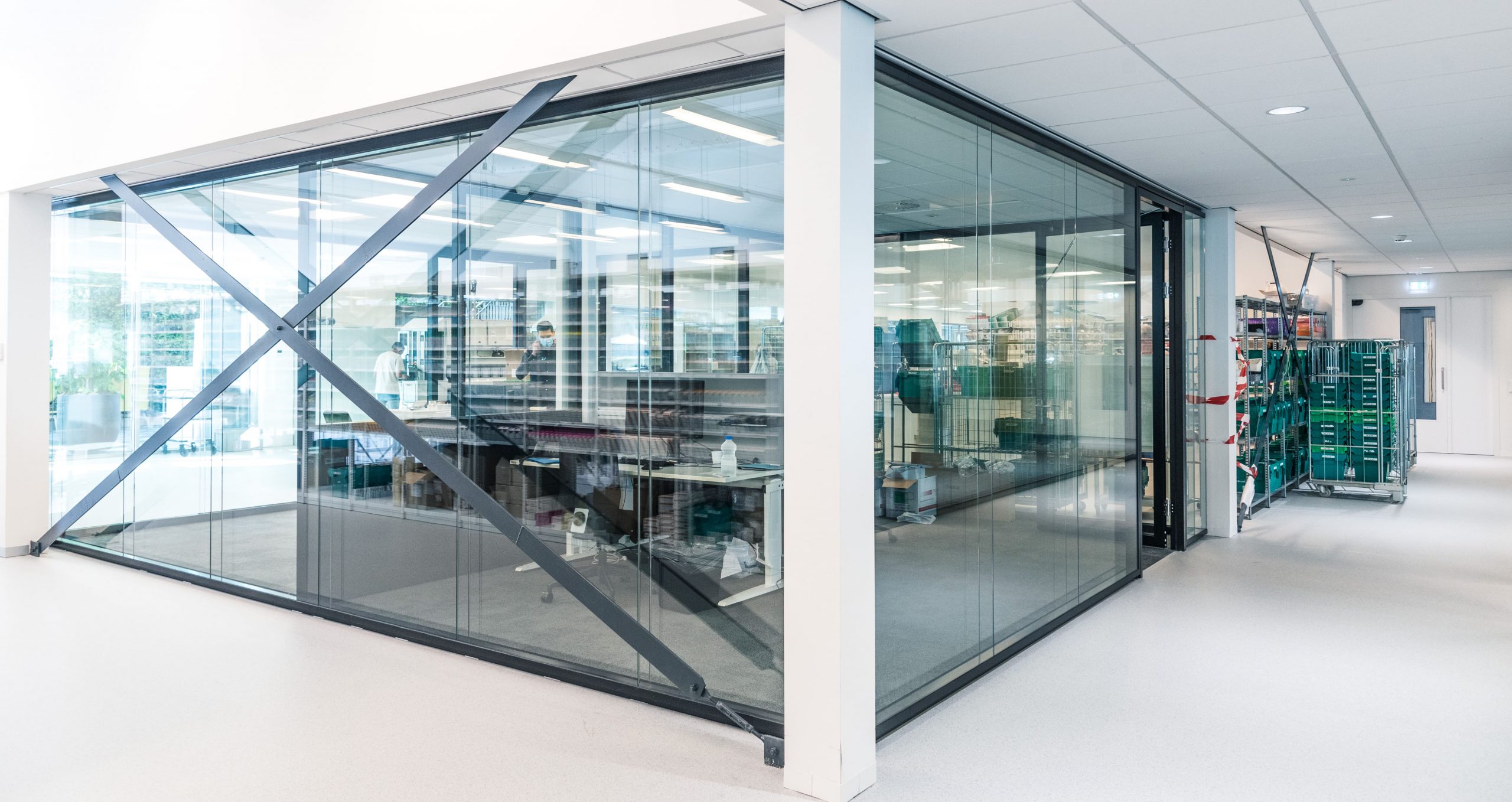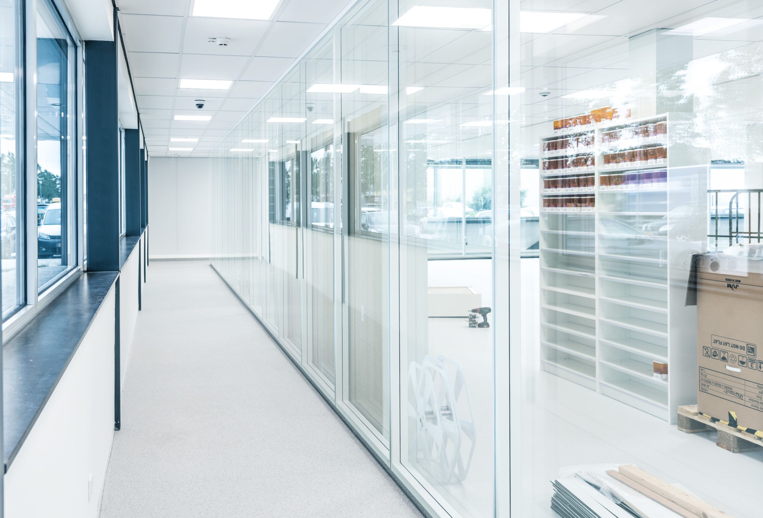 专注于洁净室的 Kropman Contamination Control 选择了 马尔斯隔断来建造这个高标准的洁净室。 对于这个洁净室,我们提供了 String² 钢墙和 String² 双块玻璃墙的组合,具有 0 和 5 毫米接头。
